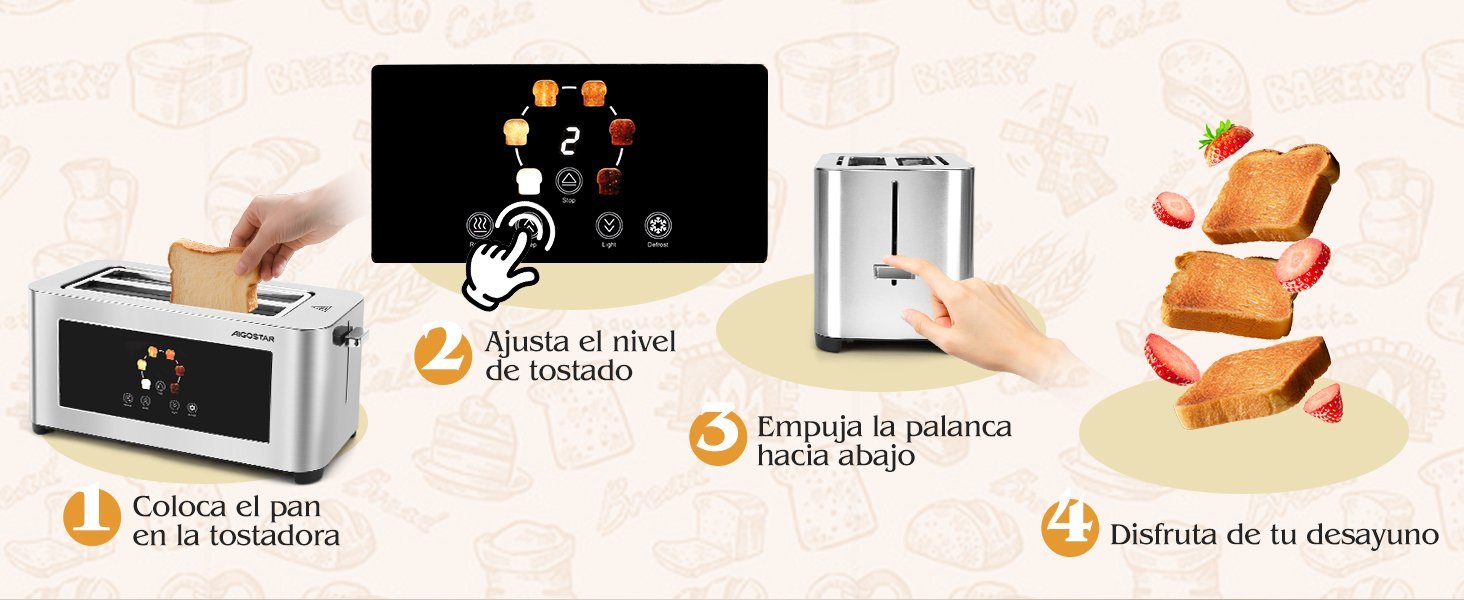 30 reviews for Aigostor Tostador de 4 Rebanadas | Ranuras Extra Anchas de 4 cm con Centrado Automático | Panel Táctil LED, 6 Niveles de Tostado | Función Descongelar, Recalentar y Cancelar | 1400W, Acabado en Acero Inoxidable