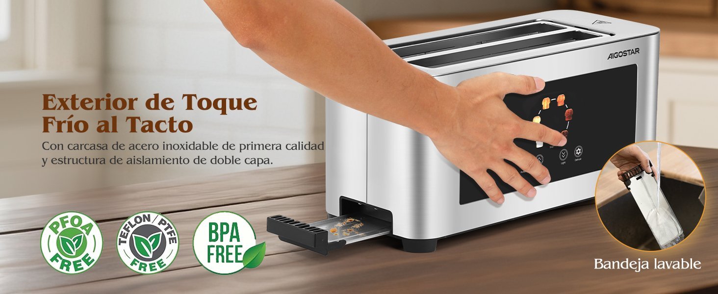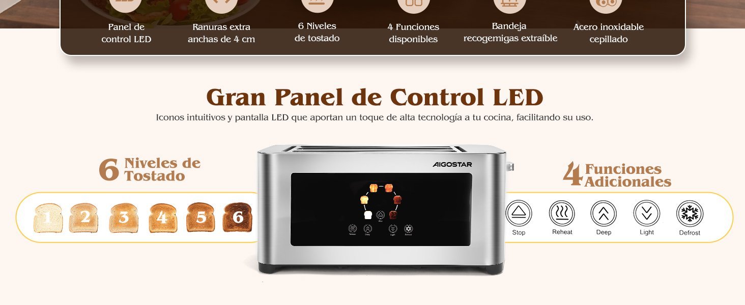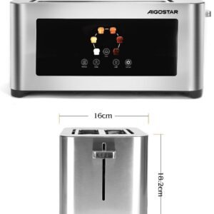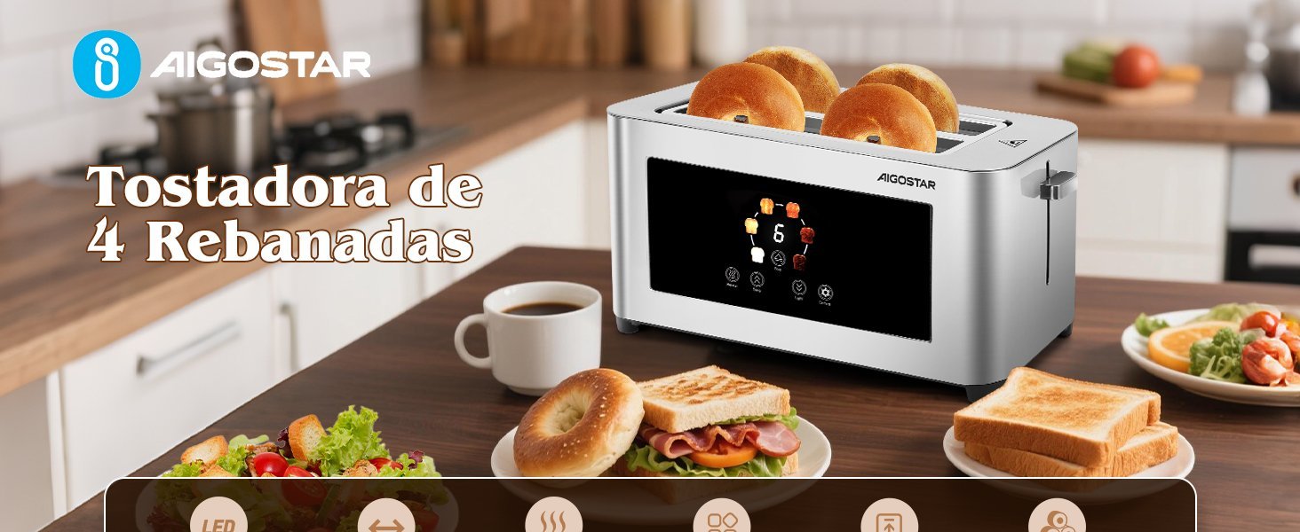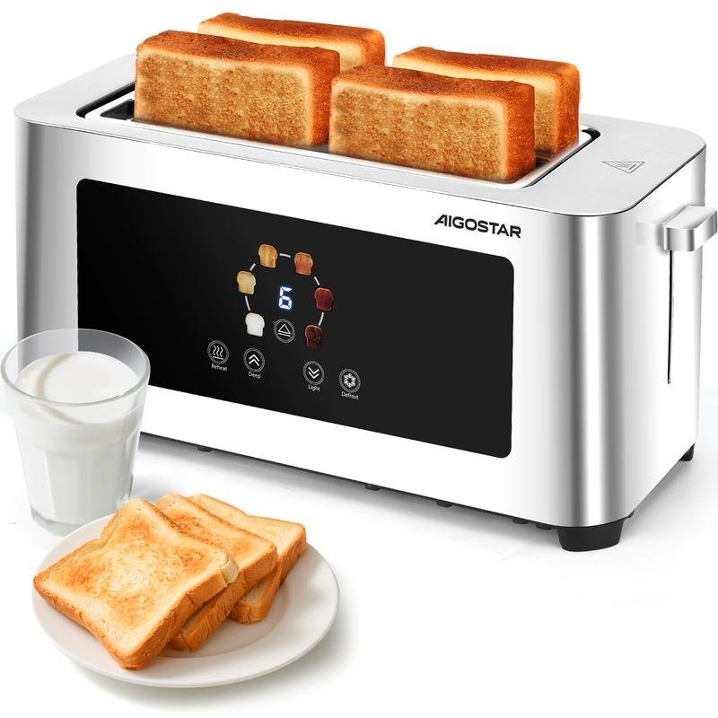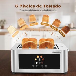 Aigostor Tostador de 4 Rebanadas | Ranuras Extra Anchas de 4 cm con Centrado Automático | Panel Táctil LED, 6 Niveles de Tostado | Función Descongelar, Recalentar y Cancelar | 1400W, Acabado en Acero Inoxidable