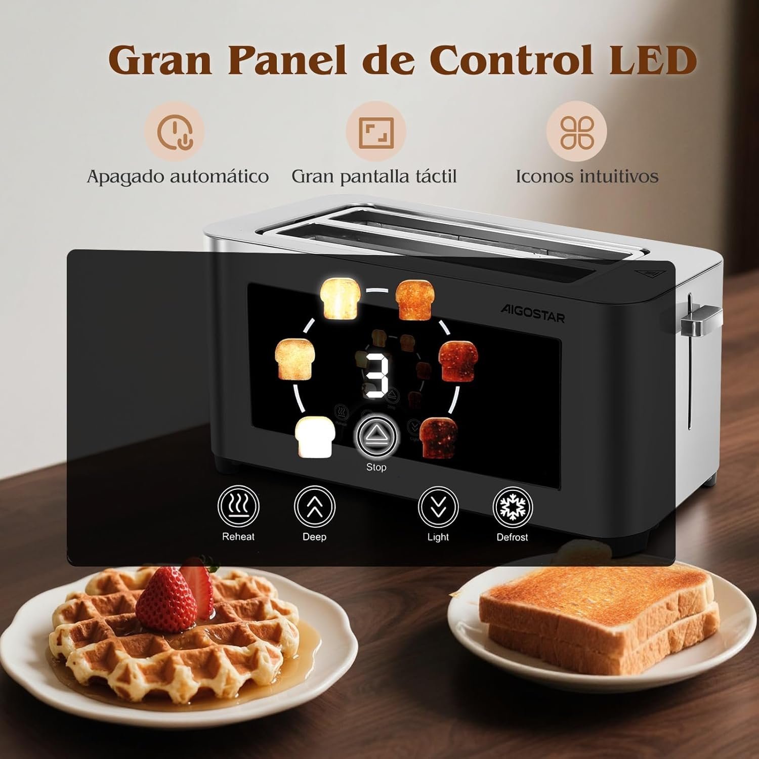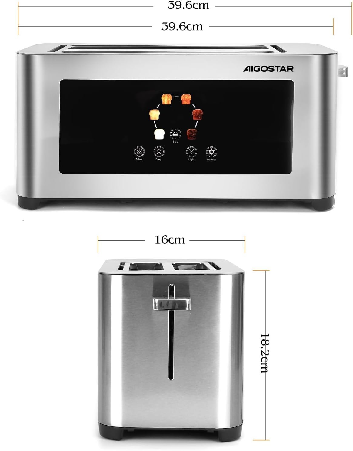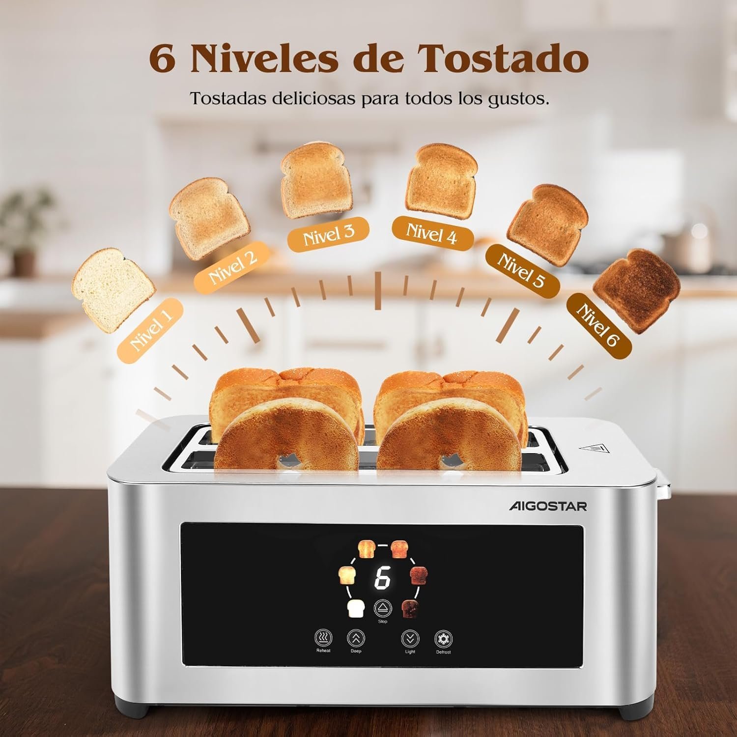 Aigostor Tostador de 4 Rebanadas | Ranuras Extra Anchas de 4 cm con Centrado Automático | Panel Táctil LED, 6 Niveles de Tostado | Función Descongelar, Recalentar y Cancelar | 1400W, Acabado en Acero Inoxidable